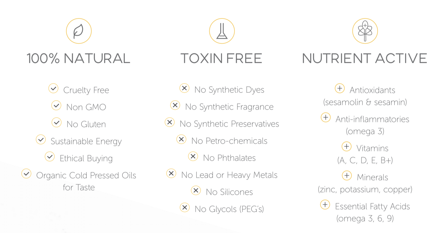 蓖麻油, 鱷梨油芝麻油, 小燭樹蠟, 肉桂 (滋養和保護)