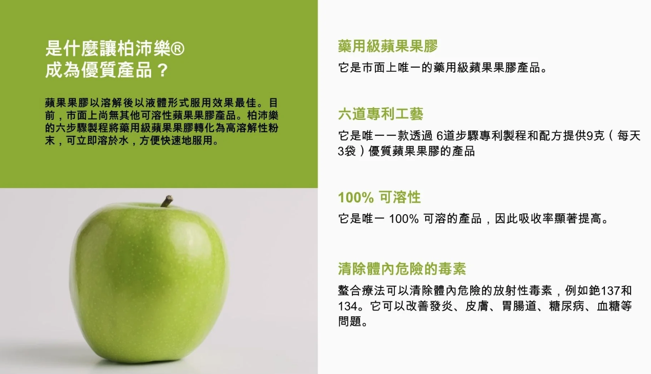 柏沛樂醫藥級蘋果果膠,含高濃縮的D-半乳糖醛酸,由於它的分子被轉化成小分子,容易被人體吸收,因此,除了腸道內的重金屬,積存於體內細胞和組織中的重金屬也可以通過尿液排出體外