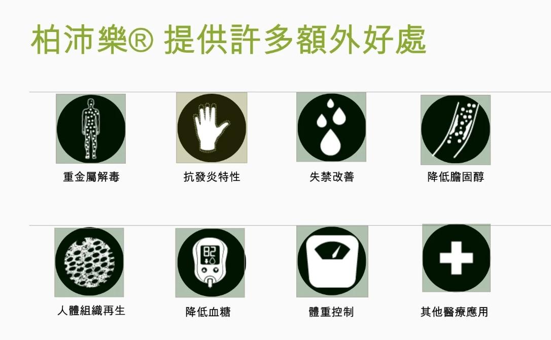 柏沛樂不但可以防止重金屬於腸道被吸收,亦可結合積存於血液及器官如腦,骨骼,肝,腎及脾內之重金屬,安全地排出體外