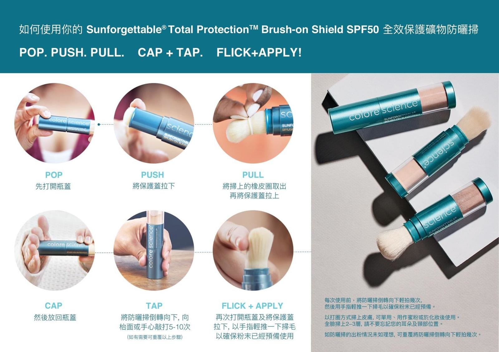 Colorescience Sunforgettable SPF 50 防曬粉是唯一100%非化學、掃上型護盾,可以隨時隨地,並可於妝容上使用。如果在面霜、打底霜、粉底液上直接使用,請確定產品已完全吸收或定妝至清爽。